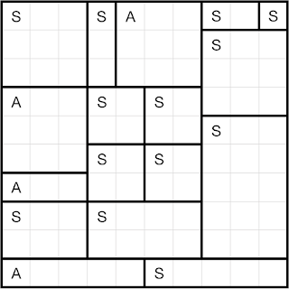 [Heyawake] puzzle, a room with an S in it must have 180-degree rotational symmetry, and a room with an A in it must NOT have 180-degree rotational symmetry. The rules are otherwise unchanged.